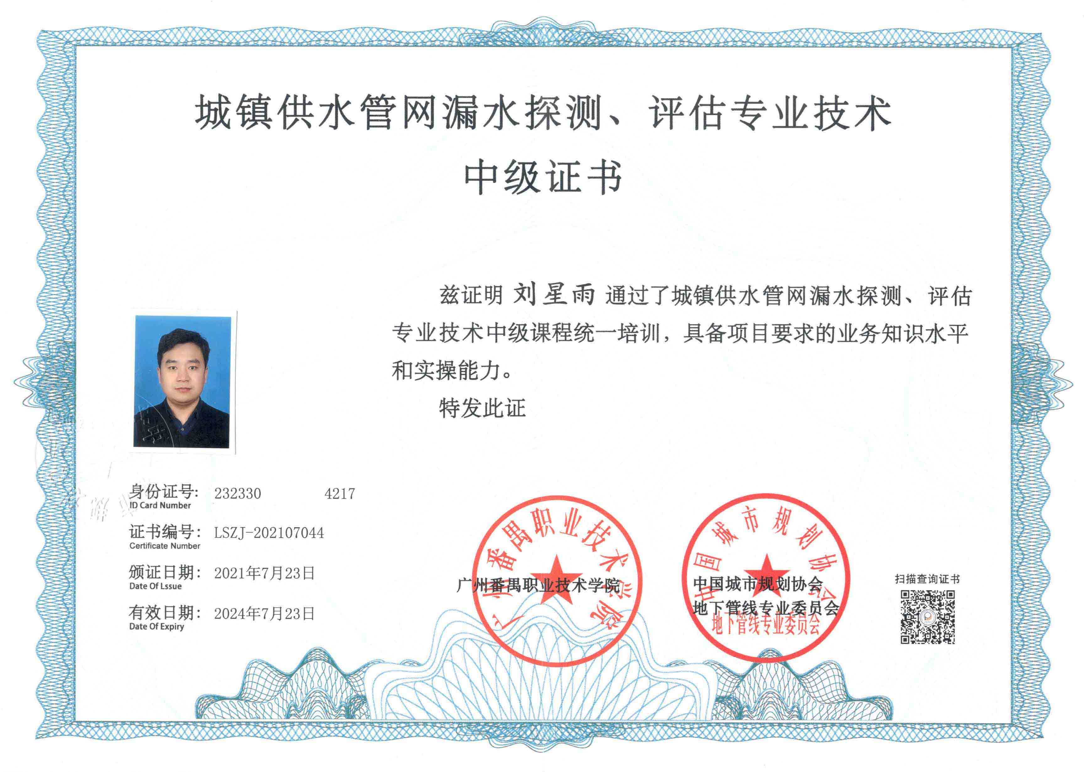 城鎮(zhèn)供水管網(wǎng)漏水探測、評估專業(yè)技術(shù)中級證書